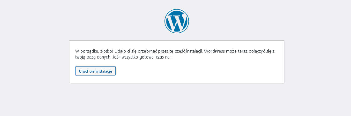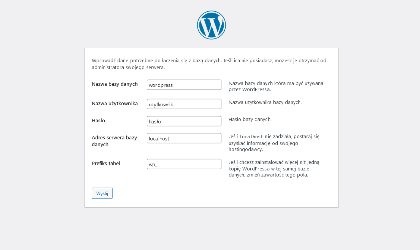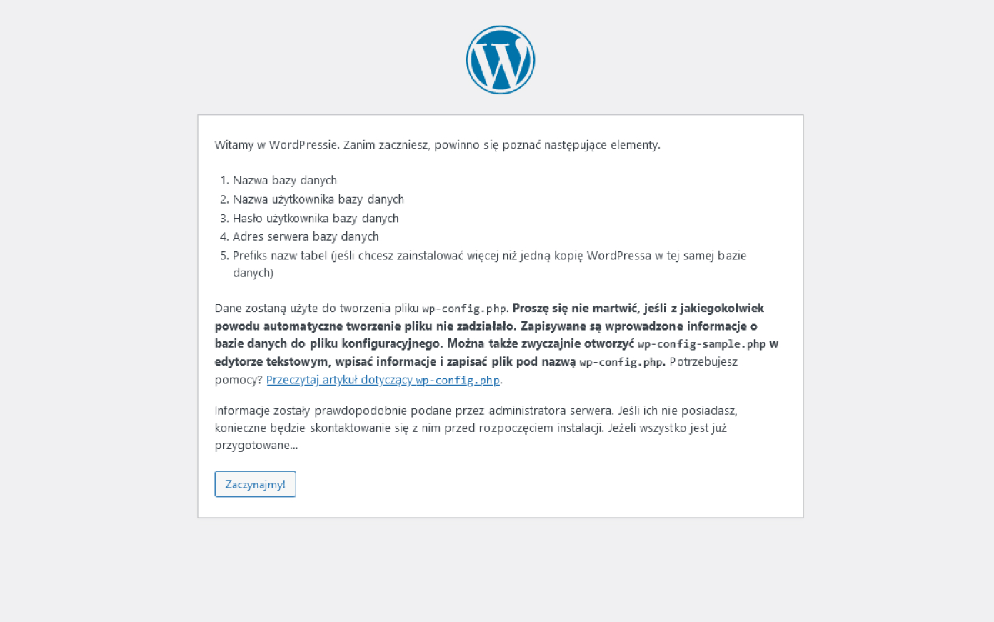 Kliknij "Zaczynajmy" żeby przejść do kolejnego ekranu. Przygotuj nazwę bazy danych, hasło i adres serwera bazy. Dobrą praktyką jest zmiana prefiksu bazy danych z domyslnego na własny, co powinno zwiększyć bezpieczeństwo strony.