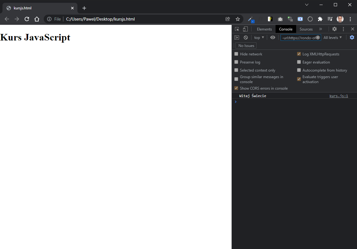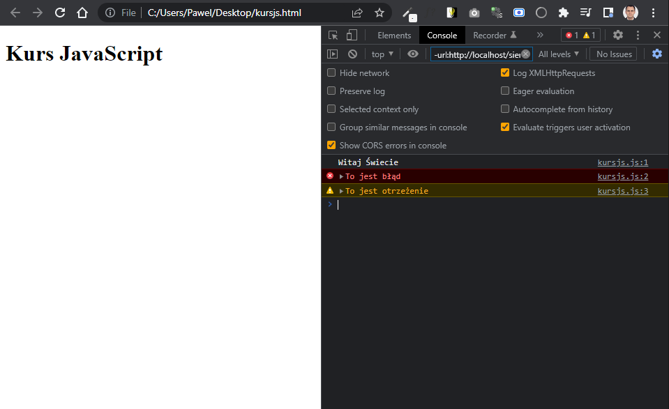 </html>Jak już można się domyślić musimy stworzyć w tym samym folderze plik kursjs.js. Plik ze skryptami dodaliśmy na końcu dokumentu HTML dla celów optymalizacyjnych – w dużym skrócie, strona szybciej się załaduje. Plik kursjs.js niech zawiera tylko taką instrukcję w jednej linii: