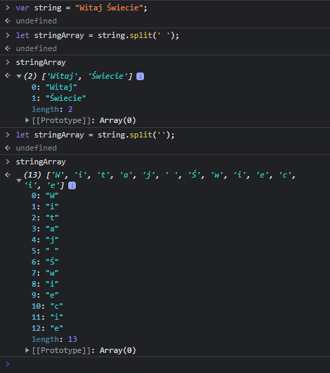 console.log(string.substring(0,5).toLowerCase());Ciągi znaków można przekonwertować na tablicę znaków lub poszczególnych jego fragmentów za pomocą metody split(). Metoda split() przyjmuje argument, który pozwala określić co ma być separatorem. Jeżeli będziemy mieli zdanie 'Witaj Świecie’ a separatorem będzie spacja, to obiektami takiej tablicy będą słowa 'witaj’ i 'świecie’. Jeżeli nie podamy żadnego paremetru, to ciąg zostanie „rozłożony” do tablicy na poszczególne litery:
