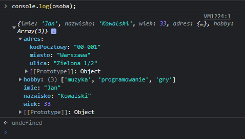 console.log(osoba1);Dostęp do poszczególnych właściwości zapewnia poznana wcześniej notacja kropkowa:
